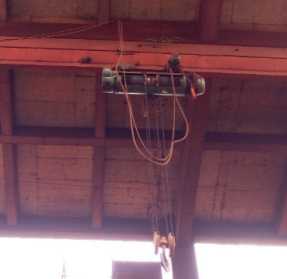 一種操作方法是:利用梯子到達平臺處,在一根鋼絲繩的兩端分別捆上麻繩,吊上合適的配重物資,把麻繩蕩到單梁的兩側,鋼絲繩的中間點用麻繩拉住,等兩端的鋼絲繩都到下面的平臺了,要連個人在線面分開拉鋼絲繩,中間的麻繩往上提,使鋼絲繩躲過軌道上的兩輪凸起結構件,再把鋼絲繩移到單梁的中間部位,再兩鋼絲繩頭都拉到平臺處,用手拉葫蘆一點點的把單梁葫蘆拉到檢修平臺的上方。